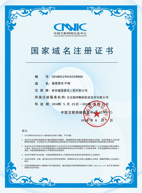 2017年10月“贵州通建”网站的开通,拉开了九游会在线手机版(大中国区),九游会在线手机版(大中国区)新一轮发展的序幕。承蒙社会各界的支持与厚爱,加上“贵州通建”人对建筑事业孜孜不倦的执著追求和锲而不舍的敬业精神以及渴望成功的梦想,今天,域名“通建建设”已由九游会在线手机版(大中国区),九游会在线手机版(大中国区)注册,并在国内顶级域名数据库中备案后正式落户“贵州通建”网站,敬请各位新老朋友关注。